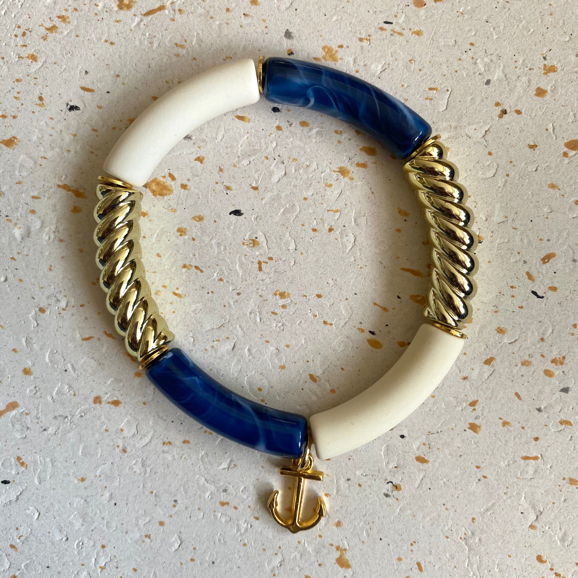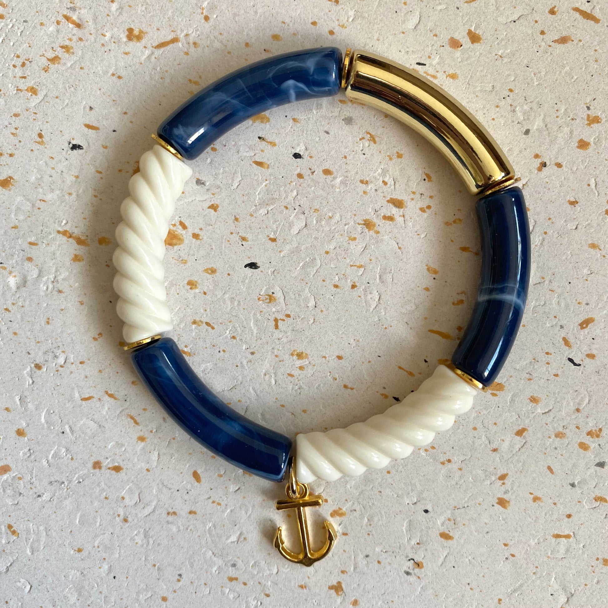 Les teintes profondes du bleu marine se mêlent à la pureté du blanc et à l’éclat subtil du doré, évoquant les paysages marins et les couchers de soleil dorés. Une délicate breloque en forme d’ancre marine ajoute une touche de caractère, symbole d’aventure et de liberté.